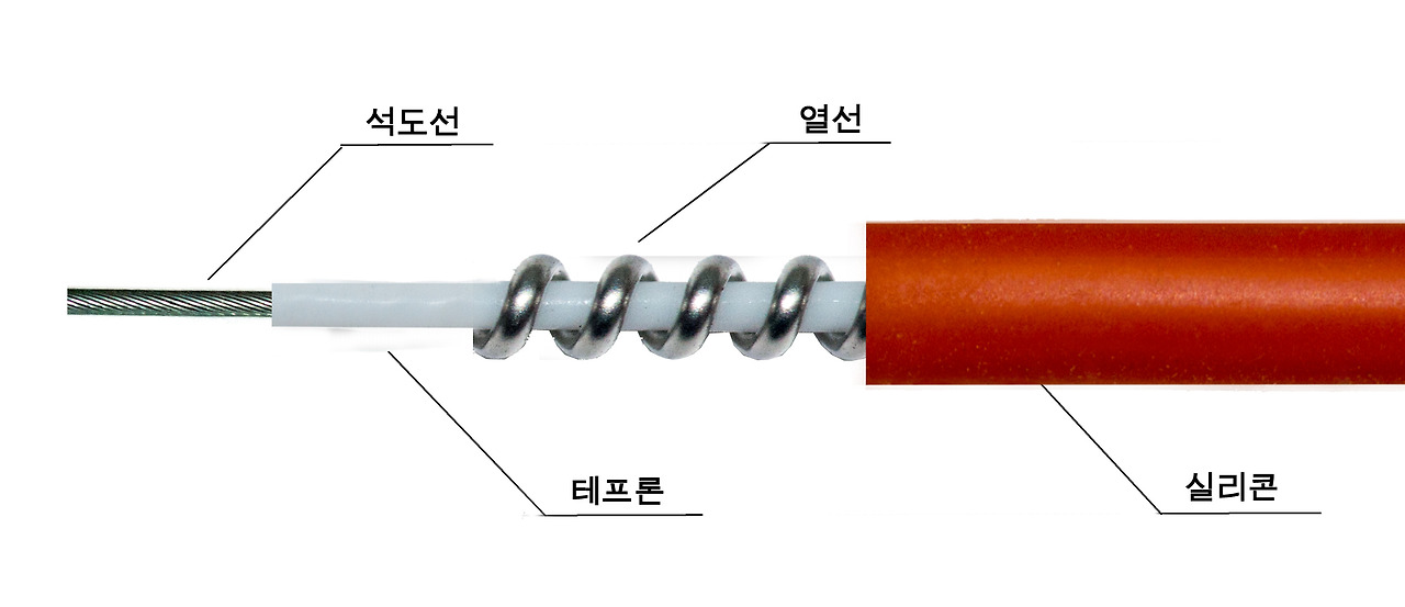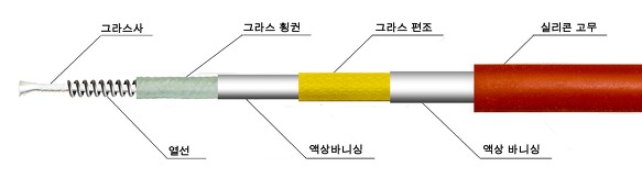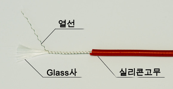 1가닥의 열선 또는 여러가닥의 열선을 집합하여 꼬운 후에 백색,회색,적색등의 실리콘고무를 피복해 놓은 열선임.